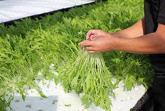 葉野菜は年間を通じて栽培をしています。現在の栽培品目はルッコラ・レッドからし菜・水菜・ハンサムレタス・バジル・パセリです。