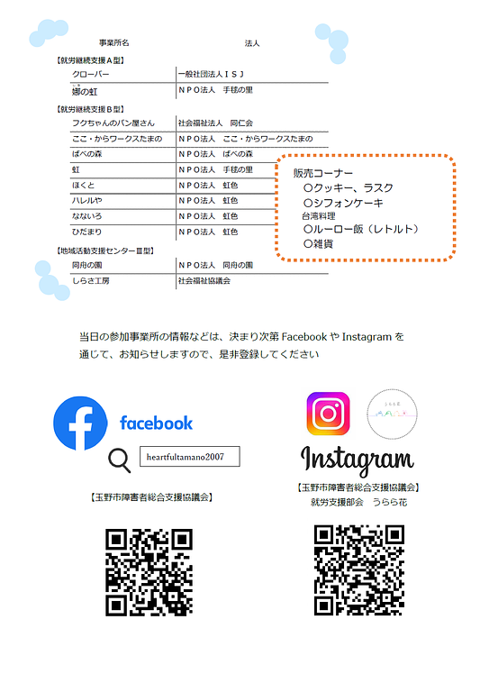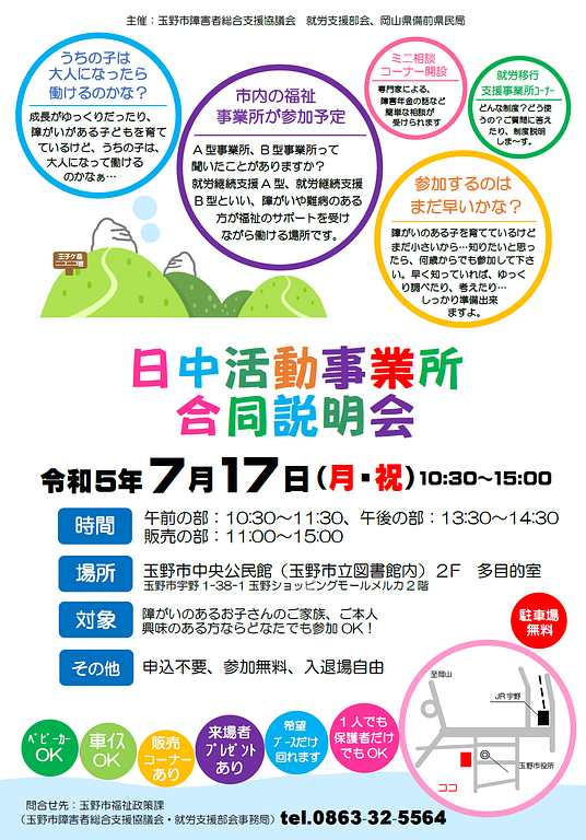2023年6月27日イベント(一般向け)日中活動事業所 合同説明会のご案内主催:玉野市障害者総合支援協議会 就労支援部会、岡山県備前県民局 日中活動事業所の合同説明会を7月17日(月)10:30~15:00に開催します。 20230628-032843.png 455KB 20230628-033042.png 176KB